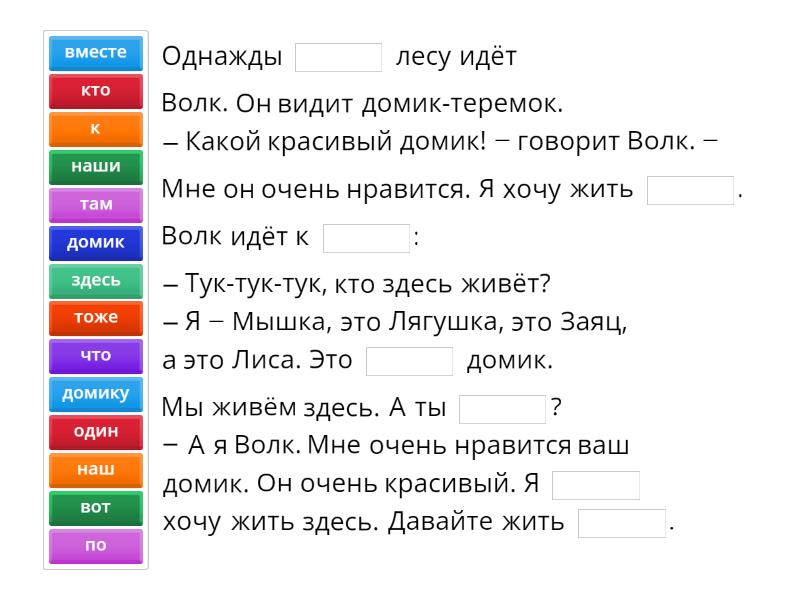 Однажды ____ лесу идёт Волк. Он видит домик-теремок. – Какой красивый домик! – говорит Волк. – Мне он очень нравится. Я хочу жить ____. Волк идёт к ____: – Тук-тук-тук, кто здесь живёт? – Я – Мышка, это Лягушка, это Заяц, а это Лиса. Это ____ домик. Мы живём здесь. А ты ____? – А я Волк. Мне очень нравится ваш домик. Он очень красивый. Я ____ хочу жить здесь. Давайте жить ____. – Волк, а что ты ____ делать? Я, Мышка, делаю суп и салат. Лягушка делает чай. Заяц делает очень хорошие фотографии ____ публикует их в Инстаграме. Все ____ фотографии Зайца. Лиса хорошо играет на гитаре и ____. А что ты умеешь ____? – Я умею охранять. Видите мои зубы? Они очень ____ . Я хочу ____ этот домик. – Охранять домик – это хорошо. – говорят Мышка, Лягушка, Заяц и Лиса. – Очень ____ идея. Какой ты молодец, Волк! Давай ____ вместе. Но у нас нет комнаты для ____. Наш домик маленький. Мышка и Лягушка живут в комнате ____ первом этаже, Заяц живёт в комнате на втором этаже, Лиса живёт на балконе. – Нет-нет, я не хочу жить в домике. Ваш домик маленький, а я большой. Я хочу жить рядом ____. Мышка, Лягушка, Заяц, Лиса и Волк живут вместе, ____ живут. Мышка и Лягушка живут ____ комнате на первом ____. Заяц живёт в комнате на ____ этаже. Лиса живёт на ____. А Волк живёт ____ домиком. Мышка делает суп и салат. Лягушка делает хороший чай. Лиса играет ____ гитаре и поёт. Заяц делает фотографии Мышки, Лягушки, Лисы и Волка и публикует фотографии в ____. Он делает рекламу ____. Все лайкают фотографии ____. Днём Волк спит рядом с ____, а ночью ____ охраняет домик, Мышку, Лягушку, Зайца и Лису.