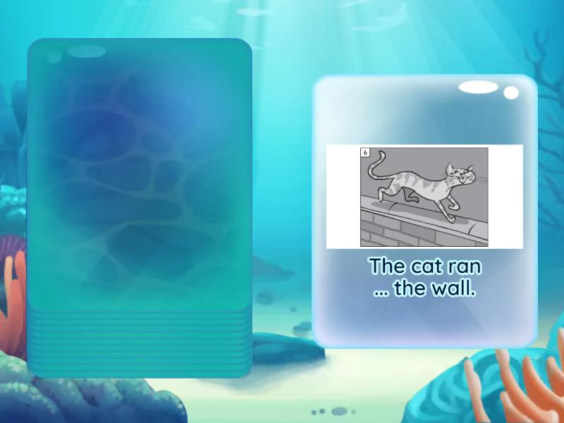 : A police helicopter flew ... the houses., The robber fell ... the stairs., A bird flew ... the bridge., They danced ... the fire., The policeman walked ... the car., The cat ran ... the wall., The road goes ... the village., The boy is climbing ... the tree., He jumped ... the swimming pool., The dog swam ... the river., The rock star threw a TV ... the window., The skiers are skiing ... the mountain.,
