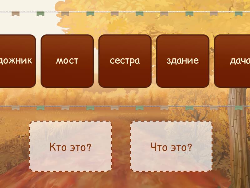 Кто это?: врач, рабочий, учёный, дядя, тётя, мать, отец, студент, сестра, студентка, художник, фермер, спортсмен, музыкант, поэт, подруга, друг, писатель, кошка, секретарь, Что это?: ручка, учебник, книга, имя, семья, тетрадь, магазин, институт, фирма, стадион, музыка, машина, мост, аптека, парк, цирк, город, ужин, здание, дача,