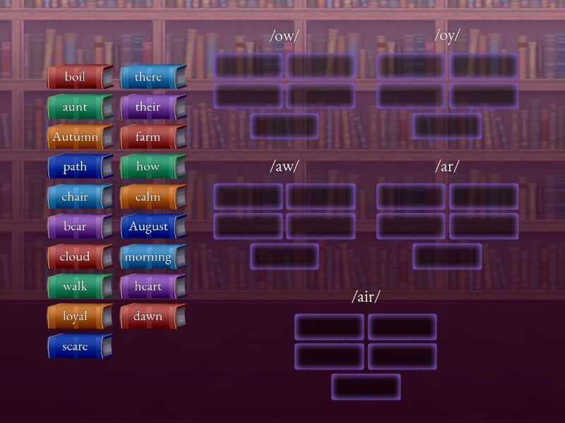 /ow/: how, cloud, /oy/: loyal, boil, /aw/: Autumn, August, walk, dawn, morning, /ar/: farm, path, calm, aunt, heart, /air/: bear, chair, their, there, scare,