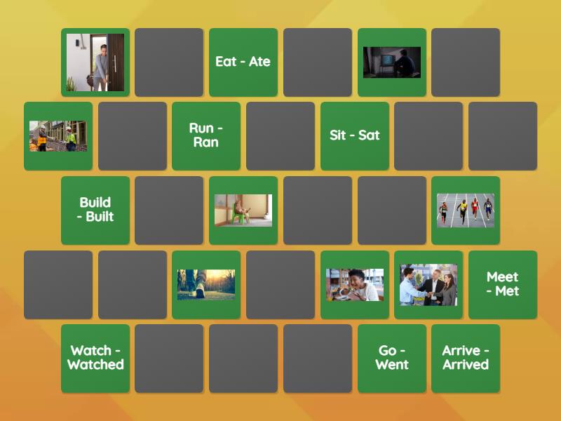 Go - Went, Eat - Ate, Arrive - Arrived, Meet - Met, Build - Built, Watch - Watched, Sit - Sat, Run - Ran, Bake - Baked, See - Saw, Travel - Travelled, Cook - Cooked, Walk - Walked, Swim - Swam, Find - Found, Fish - Fished,