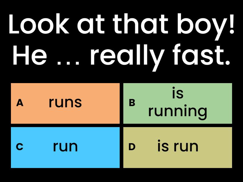1) Look at that boy! He … really fast. a) runs b) is running c) run d) is run 2) Is Anna in her room? – Yes, she … her homework now. a) does b) do c) is doing d) is do 3) Martin always … home after school. a) goes b) go c) is go d) is going 4) Where is Anna? Is she doing her homework? – No. She … on the phone. a) is talk b) is talking c) talks d) talk 5) I usually … vegetables in the supermarket. a) am buying b) buys c) am buy d) buy 6) She never … breakfast. a) is having b) have c) has d) is have 7) I usually walk to school. But it is cold and rainy today, so I … by bus. a) go b) am going c) am go d) is going 8) Be quiet. I … to the news. a) am listen b) listen c) listens d) am listening 9) My father never … home late. a) comes b) come c) is come d) is coming 10) She never … with a knife and fork. a) is eat b) eat c) is eating d) eats 11) I am busy. I … my homework right now. I’ll call you back later. a) am doing b) do c) does d) am do 12) My granny always … me a birthday cake. a) makes b) is making c) is make d) make