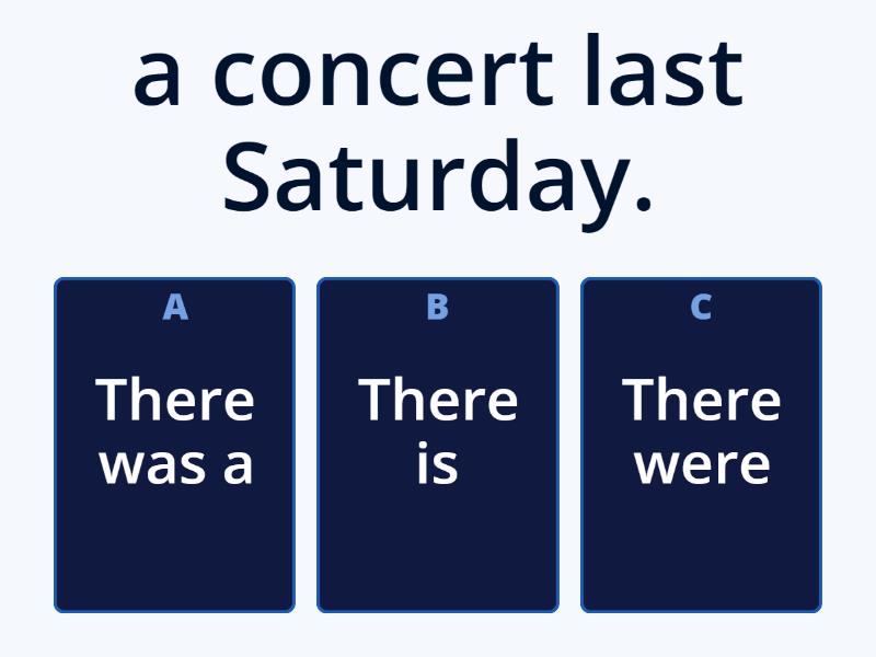 1) a concert last Saturday. a) There was a b) There is c) There were 2) a music festival in California. a) Thre are b) There is c) There were 3) many stages in Coachella. a) There is b) There were c) There are 4) many people in the party. a) There are b) The were c) There was 5) Is there a music festival in Mexico? a) Yes, there was. b) Yes, there is. c) No, there aren't. 6) Were there any rock bands? a) Yes, there was two. b) No, there wasn't two. c) Yes, there were two. 7) five musicians on the stage. a) There are b) There is c) There was 8) a lot of cars on the roads yesterday. a) There isn't b) There are c) There were 9) any good restaurants in this town? a) Are there b) Is there c) Were there 10) ten people in my class a) There is b) There are c) There were