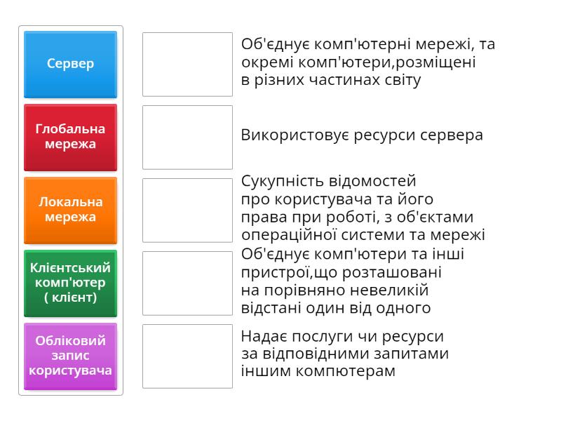 Обліковий запис користувача - Сукупність відомостей про користувача та його права при роботі, з об'єктами операційної системи та мережі, Локальна мережа - Об'єднує комп'ютери та інші пристрої,що розташовані на порівняно невеликій відстані один від одного, Сервер - Надає послуги чи ресурси за відповідними запитами іншим компютерам, Глобальна мережа - Об'єднує комп'ютерні мережі, та окремі комп'ютери,розміщені в різних частинах світу, Клієнтський комп'ютер ( клієнт) - Використовує ресурси сервера,
