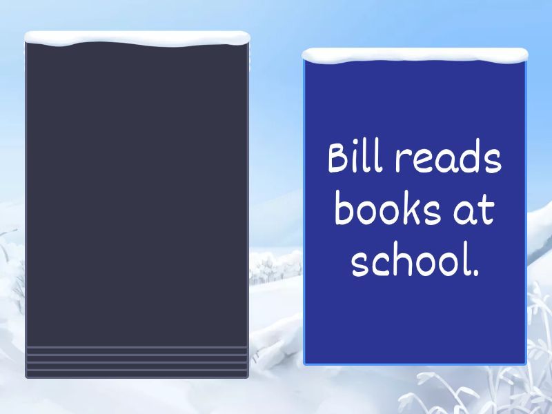 Kim likes eating ice cream., Bob and Sam play football every day., Bill reads books at school., Sally goes to bed at 11 o’clock at night., Liam makes bread with his cousin., Holly and Kate write in their notebooks..