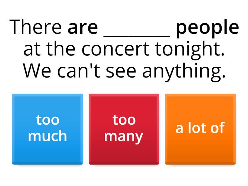 1) There are ________ people at the concert tonight. We can't see anything. a) too much b) too many c) a lot of 2) I don’t have ________ money left for shopping. I'll get money from the ATM. a) a few b) many c) any 3) We dont' have ________ milk, so we need to buy more. a) too much b) enough c) a lot of 4) She added ________ sugar to the cake, and now it’s too sweet. a) a lots of b) too many c) too much 5) There aren’t ________ chairs in the room. Let's bring ten more. a) enough b) a few c) too many 6) We have ________ friends coming over for dinner tonight, so don't make much food. a) too many b) enough c) a few 7) Is there ________ butter left in the fridge? a) some b) any c) a lot 8) They have ________ oranges, so they don’t need to buy more. a) a few b) lots c) enough 9) We need ________ carrots to make the cake. a) some b) too many c) a lot 10) There isn’t ________ time left to finish the exam. a) much b) many c) a little 11) I need ________ apples to make the pie. Not a lot but not a few either. a) too much b) some c) many 12) She doesn’t have ________ friends in this city. She feels very lonely. a) much b) any c) many 13) We’ve got ________ bread left for breakfast. It's fine for 15 people. a) too many b) not enough c) a lot of 14) There are ________ books on the shelf, so you can choose one to read. a) a few b) not much c) too much 15) He drank ________ water before the race; now she can't run. a) too much b) too many c) not enough 16) A: Do you have ________ sugar for the coffee? B: Yes, it's perfect. a) a lot b) enough c) too much 17) There aren’t ________ eggs in the fridge. We only have a couple. a) a few b) any c) many 18) I made ________ pasta for dinner tonight so, you can take some home if you want. a) lots of b) too many c) much 19) I added ________ milk to my coffee, and now it tastes better. a) many b) a little c) too much 20) I don’t need ________ help with my project, I can do it myself. a) much b) too many c) any