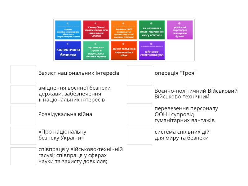ВІЙСЬКОВЕ СПІВРОБІТНИЦТВО - зміцнення воєнної безпеки держави, забезпечення її національних інтересів, Основні напрями міжнародного військового співробітництва України - Воєнно-політичний Військовий Військово-технічний, українські миротворці виконували функції - перевезення персоналу ООН і супровід гуманітарних вантажів, Україна та НАТО в подальшому розвиватимуть такі напрями співпраці: - співпраця у військово-технічній галузі; співпраця у сферах науки та захисту довкілля;, колективна безпека - система спільних дій для миру та безпеки, У якому Законі закладені принципи національної безпеки - «Про національну безпеку України», Що визначає Стратегія національної безпеки України - Захист національних інтересів, один із складників інформаційної війни - Розвідувальна війна, як називався план поширення хаосу в Україні - операція "Троя",