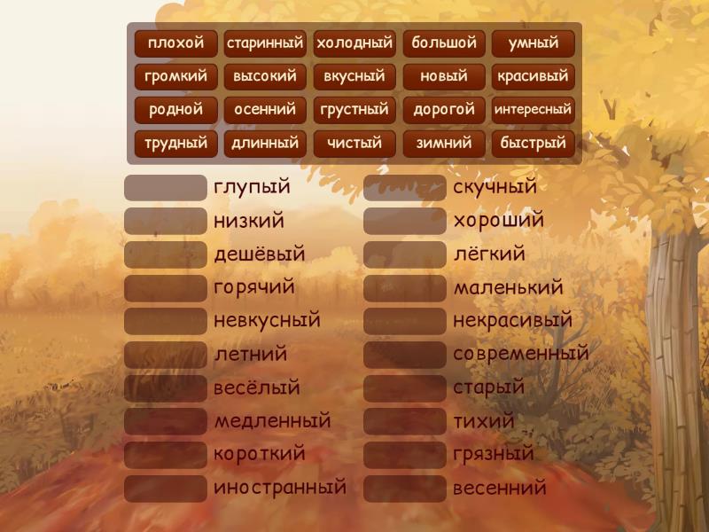 быстрый - медленный, длинный - короткий, высокий - низкий, чистый - грязный, новый - старый, старинный - современный, большой - маленький, плохой - хороший, интересный - скучный, грустный - весёлый, родной - иностранный, осенний - весенний, холодный - горячий, дорогой - дешёвый, зимний - летний, громкий - тихий, вкусный - невкусный, красивый - некрасивый, умный - глупый, трудный - лёгкий,
