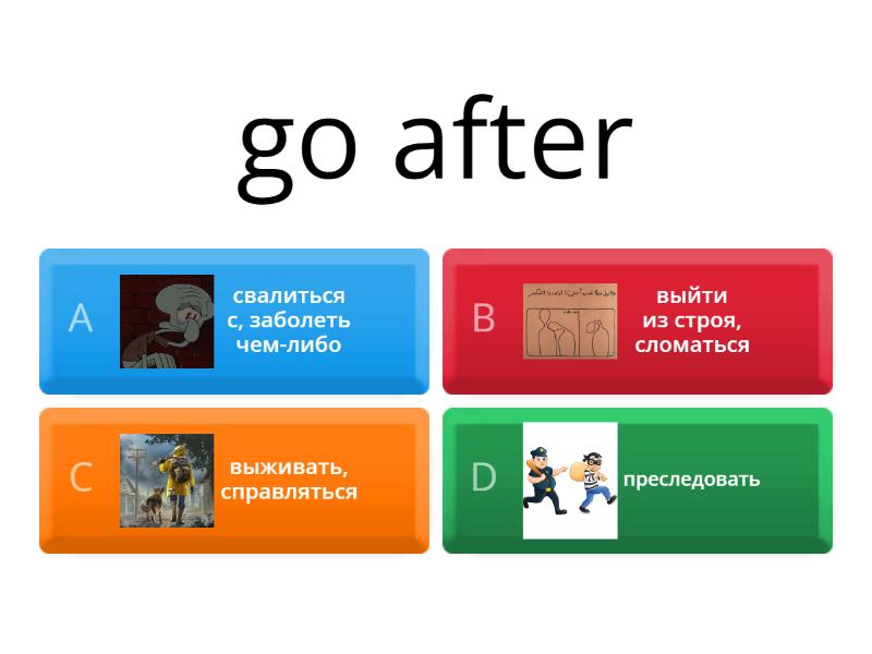 1) go after a) свалиться с, заболеть чем-либо b) выйти из строя, сломаться c) выживать, справляться d) преследовать 2) go down with a) идти, подходить (об одежде) b) свалиться с, заболеть чем-либо c) повышать, увеличивать d) выживать, справляться 3) go off a) преследовать b) получить опыт c) выйти из строя, сломаться d) свалиться с, заболеть чем-либо 4) go through a) преследовать b) свалиться с, заболеть чем-либо c) получить опыт d) выживать, справляться 5) go up a) преследовать b) выйти из строя, сломаться c) свалиться с, заболеть чем-либо d) повышать, увеличивать 6) go with a) идти, подходить (об одежде) b) преследовать c) выживать, справляться d) свалиться с, заболеть чем-либо 7) go without a) выйти из строя, сломаться b) повышать, увеличивать c) выживать, справляться d) свалиться с, заболеть чем-либо