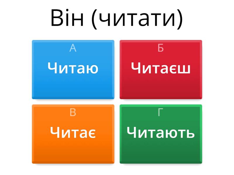1) Він (читати) a) Читаю b) Читаєш c) Читає d) Читають 2) Я (читати) a) Читаємо b) Читають c) Читаєш d) Читаю 3) Ми (співати) a) Співаємо b) Співають c) Співаєте d) Співаю 4) Ви (дружити) a) Дружу b) Дружите c) Дружимо d) Дружать