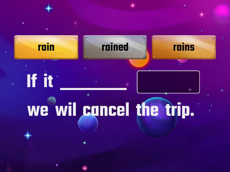 If it _______ ____ we wil cancel the trip. If they _____ sell their house, they _____ rich. ____ If you ______, you ________ the exam.____ If he ____ the ice, it melts. Unless Vivi ________, she _________ money. ____ Unless Victor _____________ to the party, I _______ sad. ____ Everybody ____________ sad if we ___________ the game. ____ Valeria buys churros if she ______________ money. ____ If Carolina _______________ to school , she ________ a lot. ____ If Daniela_______ good grades, her mom ____________ proud of her. ____ If Vanessa __________________ , she _________ money. ____ If the party _________ boring, we ________ home. ____ Unless you ______________ , you feel tired.don't sleep ____ Viviana __________ angry if her students ___________ the exam.____ If you ________ bad, you lose the match. ____