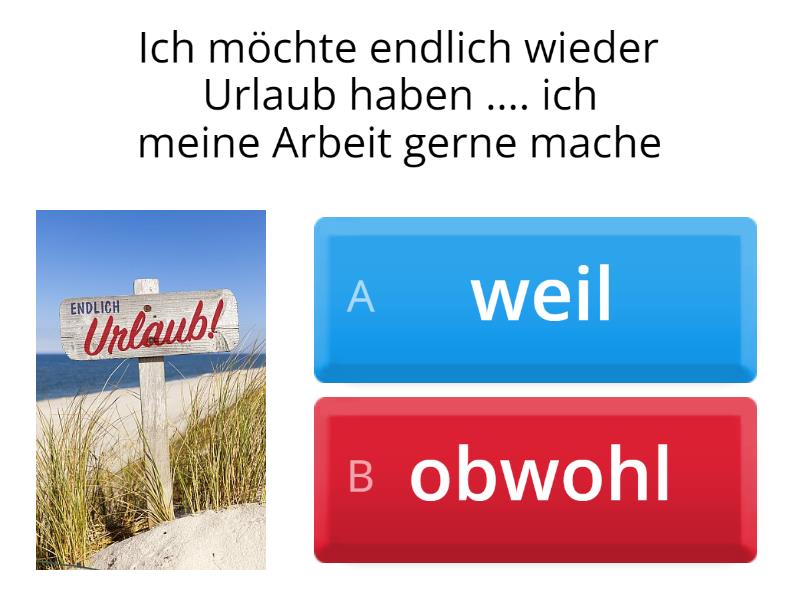 1) Ich möchte endlich wieder Urlaub haben .... ich meine Arbeit gerne mache a) weil b) obwohl 2) ... ich sehr viel arbeite, kann ich mir keine Urlaubsreise leisten. a) weil b) obwohl 3) Ich suche einen neuen Job ... meine Kollegen sehr nett sind a) weil b) obwohl 4) Maria isst gern indisches Essen, ... sie ein paar Jahre in Indien gelebt hat. a) weil b) obwohl 5) Sarah fährt mit dem Fahrrad, ... es regnet. a) weil b) obwohl 6) Ich habe kein Auto, ... ich in der Stadt kein Auto brauche. a) weil b) obwohl 7) Ich habe vor, nächstes Jahr nach Japan zu fliegen, ...die Urlaubsreise viel kostet. a) weil b) obwohl 8) Johannes lernt Spanisch, ... er in Spanien arbeiten möchte. a) weil b) obwohl 9) Familie Schmidt freut sich, ... sie ein günstiges Hotel gefunden hat. a) weil b) obwohl 10) Hans geht am Strand spazieren, ... es sehr kalt und windig ist. a) weil b) obwohl