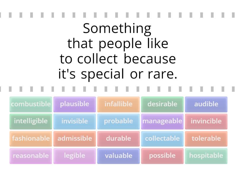 collectable - Something that people like to collect because it's special or rare., durable - Strong and lasts a long time without breaking., fashionable - popular and stylish right now., desirable - Something people want because it's good or attractive., reasonable - Fair and makes sense., valuable - Worth a lot of money or very important., hospitable - Friendly and welcoming to guests., tolerable - Something you can put up with, even if it's not perfect., manageable - Easy to handle or control., invisible - Something you can't see., invincible - Can't be defeated or beaten., infallible - Always right and never makes mistakes., intelligible - Easy to understand., legible - Easy to read., audible - Loud enough to hear., combustible - Can catch fire easily., admissible - Allowed or accepted, especially in a certain situation., plausible - Seems believable or possible., probable - Likely to happen., possible - Something that can happen or be done.,