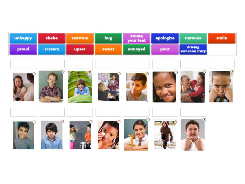 stomp your feet, smile, annoyed, driving someone crazy, apologize, nervous, upset, shake, sweat, tantrum, scream, pout, unhappy, proud, hug,