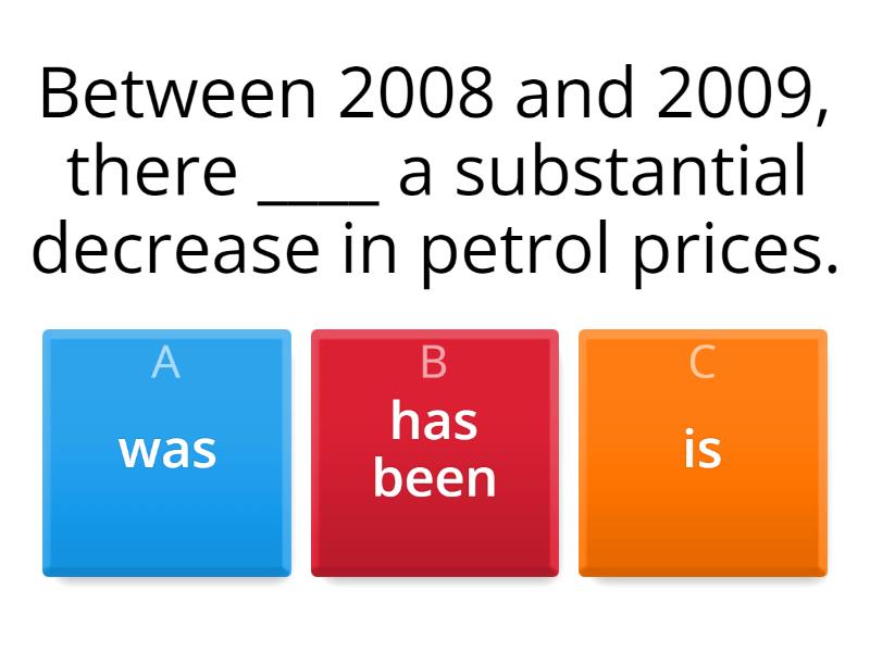 1) Between 2008 and 2009, there ____ a substantial decrease in petrol prices. a) was b) has been c) is 2) Petrol prices _____ substantially since 2009. a) rose b) have risen c) are rising 3) The figure shows that if the price of petrol ______ to rise over the next five years, fewer people will choose to drive. a) will continue b) continues c) is continuing 4) As a general rule, car use _____ positively with per capita income. a) correlates b) is correlating c) was correlating 5) The percentage of households in the UK with access to a car _____ from 50 per cent to 73 per cent between 1975 and 2000. a) is increasing b) was increasing c) increased 6) According to the graph, car use _______ substantially when the oil crisis began. a) already rose b) was already rising c) will rise