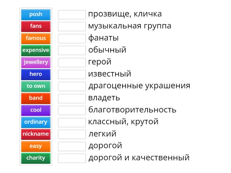 famous - известный, nickname - прозвище, кличка, band - музыкальная группа, posh - дорогой и качественный, expensive - дорогой, cool - классный, крутой, easy - легкий , jewellery - драгоценные украшения, ordinary - обычный, to own - владеть, hero - герой, fans - фанаты, charity - благотворительность ,