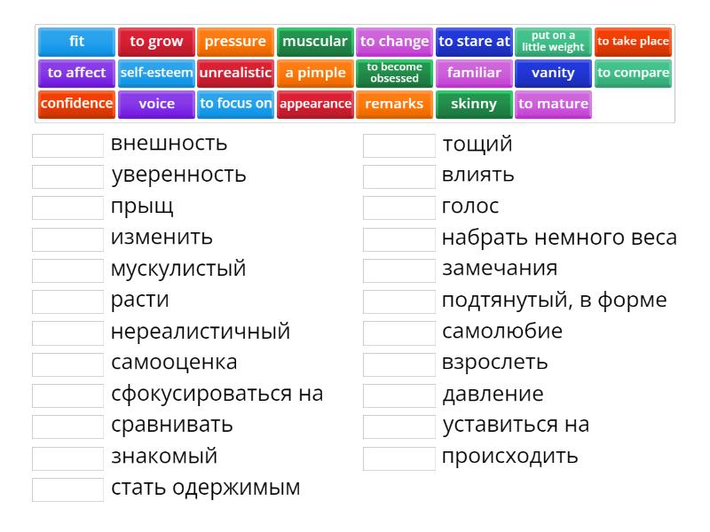 skinny - тощий, put on a little weight - набрать немного веса, muscular - мускулистый, a pimple - прыщ, to stare at - уставиться на, remarks - замечания, familiar - знакомый, to change - изменить, to grow - расти, appearance - внешность, to affect - влиять, to mature - взрослеть, to compare - сравнивать, voice - голос, to take place - происходить, self-esteem - самооценка, pressure - давление, to become obsessed - стать одержимым, fit - подтянутый, в форме, unrealistic - нереалистичный, vanity - самолюбие, to focus on - сфокусироваться на, confidence - уверенность,