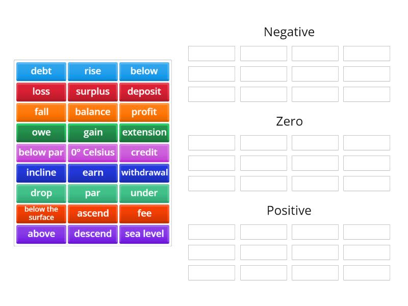 Negative: below, under, withdrawal, below par, below the surface, loss, fee, descend, drop, debt, fall, owe, Zero: par, sea level, 0° Celsius, balance, Positive: above, profit, ascend, incline, extension, deposit, gain, rise, earn, credit, surplus,
