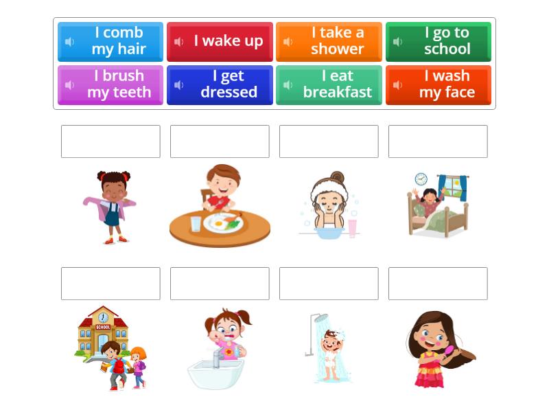 I wake up , I wash my face , I take a shower , I brush my teeth , I comb my hair , I get dressed , I eat breakfast , I go to school,