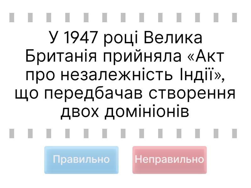 Правильно: У 1947 році Велика Британія прийняла «Акт про незалежність Індії», що передбачав створення двох домініонів, Кашмір став головною причиною першої індо-пакистанської війни, Конституція Індії, яка проголосила її республікою, набула чинності у 1950 році, Індія була однією з країн-засновниць «Руху неприєднання», У 1971 році Індія підтримала незалежність Східного Пакистану, який став Бангладеш, Індіра Ганді стала прем'єр-міністром Індії у 1966 році, Раджив Ганді був убитий терористом-смертником у 1991 році., Манмохан Сінгх був першим сикхом на посаді прем’єр-міністра Індії, Нарендра Моді став прем’єр-міністром Індії у 2014 році, Сикхська проблема втратила свою актуальність на початку ХХІ століття, Індія активно співпрацює з Україною у військово-технічній сфері, Неправильно: Індія стала незалежною державою в результаті мирного процесу, без будь-яких конфліктів, Першим прем'єр-міністром незалежної Індії став Мухаммед Алі Джинна, Штурм Золотого храму в Амрітсарі в 1984 році був спрямований проти тамільських сепаратистів, Тамільський сепаратизм був головною проблемою штату Кашмір, Уряд Індії в 1980-х роках підтримував тамільських сепаратистів на Шрі-Ланці, «Рух неприєднання» передбачав військову співпрацю між країнами-учасниками, Під час першої індо-пакистанської війни Пакистан підтримував ООН у вирішенні конфлікту, Індія є членом Ради Безпеки ООН як постійний член, Сикхізм — одна з найбільших релігій Індії, заснована на вірі в багатьох богів,