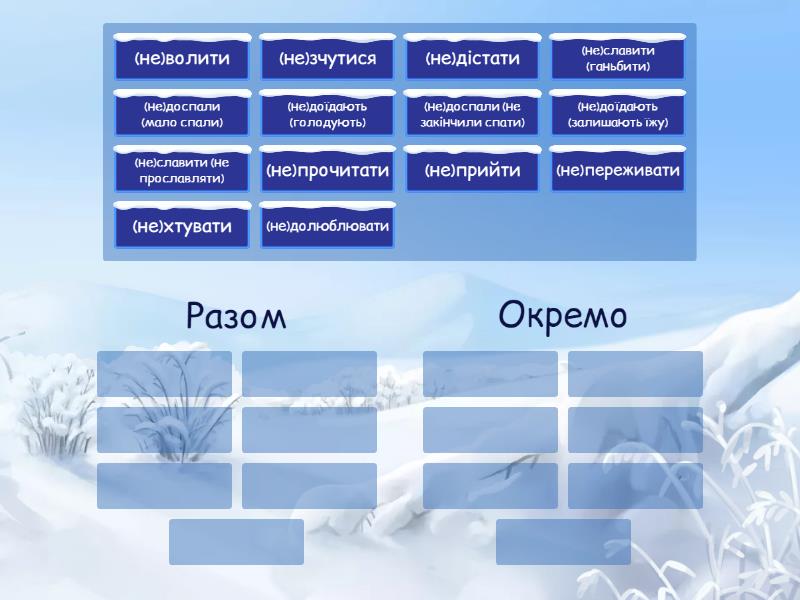 Разом: (не)зчутися, (не)долюблювати, (не)доїдають (голодують), (не)волити, (не)славити (ганьбити), (не)хтувати, (не)доспали (мало спали), Окремо: (не)прийти, (не)дістати, (не)переживати, (не)доїдають (залишають їжу), (не)славити (не прославляти), (не)прочитати, (не)доспали (не закінчили спати),