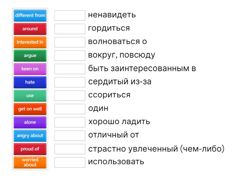 get on well - хорошо ладить, different from - отличный от, argue - ссориться, alone - один, around - вокруг, повсюду, use - использовать, hate - ненавидеть , worried about - волноваться о, proud of - гордиться , keen on - страстно увлеченный (чем-либо), interested in - быть заинтересованным в, angry about - сердитый из-за,