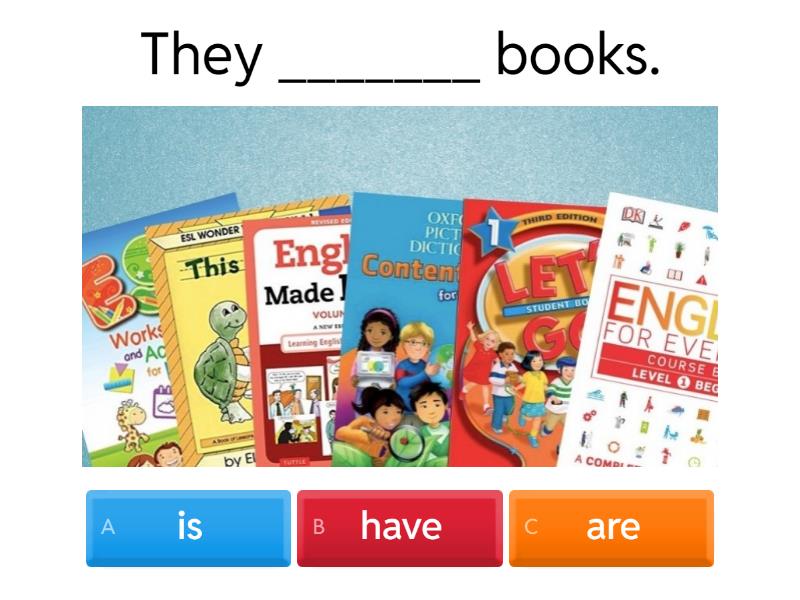 1) They _______ books. a) is b) have c) are 2) It's a _______________. a) bookcase. b) cupboard. c) board. 3) It _______ a chair. It's a table. a) is b) isn't c) are 4) What's ________? It's a pen. a) this b) they c) are 5) What _____ they? They are crayons. a) is b) isn't c) are