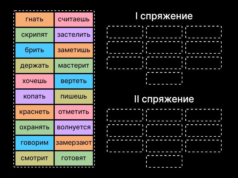 I спряжение: считаешь, хочешь, пишешь, брить, копать, застелить, охранять, волнуется, замерзают, краснеть, II спряжение: отметить, говорим, вертеть, смотрит, готовят, держать, мастерит, скрипят, заметишь, гнать,