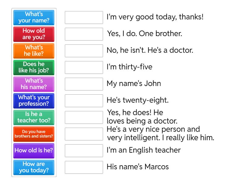 What's your name? - My name's John, How old are you? - I'm thirty-five, What's your profession? - I'm an English teacher, How are you today? - I'm very good today, thanks!, Do you have brothers and sisters? - Yes, I do. One brother., What's his name? - His name's Marcos, How old is he? - He's twenty-eight., Is he a teacher too? - No, he isn't. He's a doctor., What's he like? - He's a very nice person and very intelligent. I really like him., Does he like his job? - Yes, he does! He loves being a doctor.,