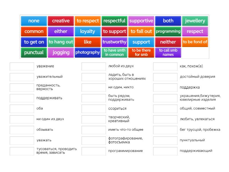 to be there for smb - быть рядом, поддерживать, both - оба, to call smb names - обзывать, common - общий, совместный, creative - творческий, креативный, either - любой из двух, to fall out - ссориться, to be fond of - любить, увлекаться, to get on - ладить, быть в хороших отношениях, to have smth in common - иметь что-то общее, to hang out - тусоваться, проводить время, зависать, jewellery - украшения,бижутерия, ювелирные изделия, jogging - бег трусцой, пробежка, like - как, похож(е), loyalty - преданность, верность, neither - ни один из двух, none - ни один, никто, photography - фотографирование, фотосъемка, programming - программирование , punctual - пунктуальный , to respect - уважать , respect - уважение , respectful - уважительный, support - поддержка , to support - поддерживать , supportive - поддерживающий , trustworthy - достойный доверия,