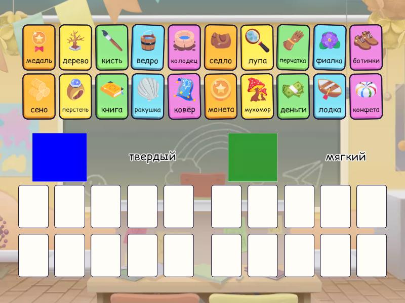твердый: мухомор, лупа, ковёр, лодка, книга, конфета, монета, ракушка, ботинки, колодец, мягкий: медаль, ведро, дерево, седло, сено, фиалка, кисть, перчатка, деньги, перстень,