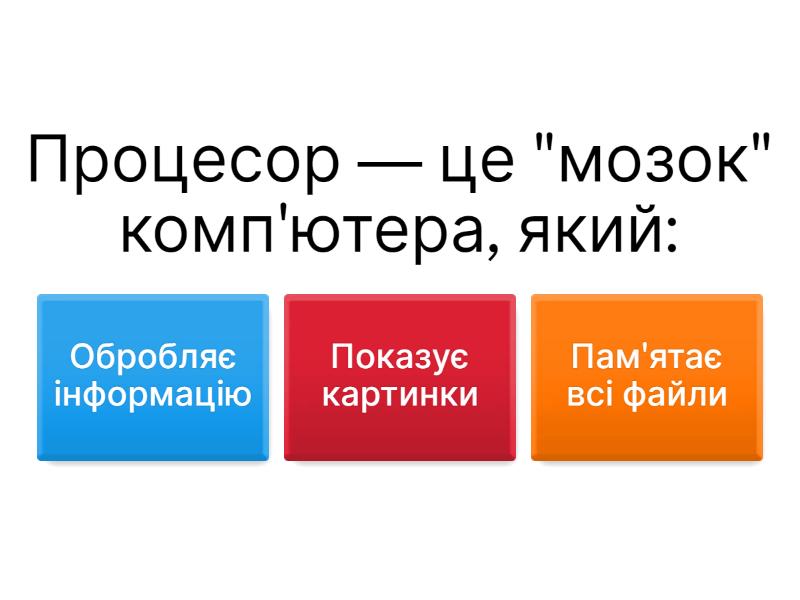 1) Процесор — це "мозок" комп'ютера, який: a) Обробляє інформацію b) Показує картинки c) Пам'ятає всі файли 2) Монітор — це екран, на якому: a) Чути музику b) Ми бачимо всі картинки c) Ми натискаємо кнопки 3) Мишка допомагає: a) Надсилати повідомлення b) Знімати відео c) Переміщати курсор на екрані 4) Жорсткий диск - це місце, де комп'ютер: a) Відтворює музику b) Зберігає всі файли і програми c) Зберігає тепло 5) Блок живлення дає комп'ютеру: a) Нічого b) Звуки c) Електричну енергію 6) Відеокарта допомагає комп'ютеру показувати: a) Обробку графіки b) Зберігати дані c) Керувати курсором 7) Це велика плата, на якій знаходяться всі важливі деталі комп'ютера: a) Материнська плата b) Системна плата c) Ігрова плата