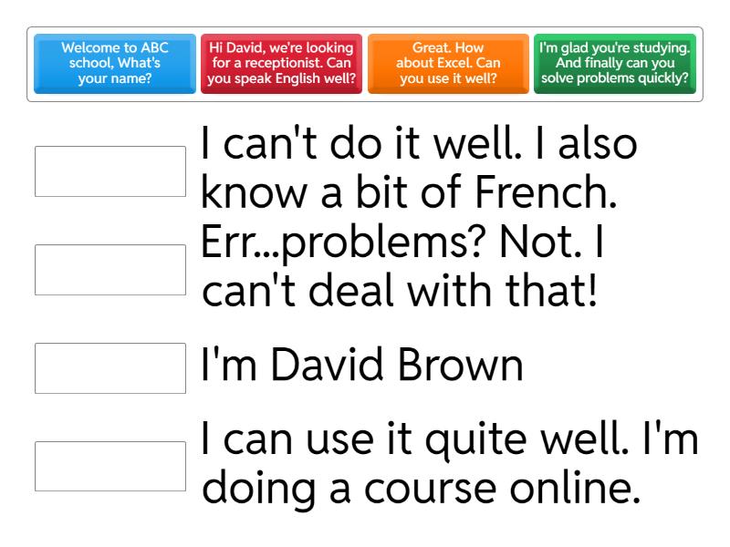 Welcome to ABC school, What's your name? - I'm David Brown, Hi David, we're looking for a receptionist. Can you speak English well? - I can't do it well. I also know a bit of French., Great. How about Excel. Can you use it well? - I can use it quite well. I'm doing a course online., I'm glad you're studying. And finally can you solve problems quickly? - Err...problems? Not. I can't deal with that!,