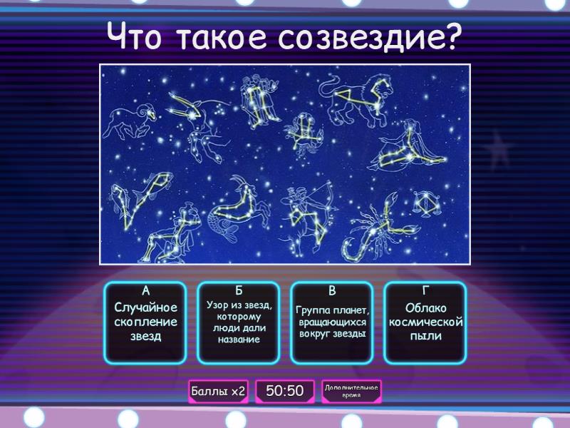 1) Что такое созвездие? a) Случайное скопление звезд b) Узор из звезд, которому люди дали название c) Группа планет, вращающихся вокруг звезды d) Облако космической пыли 2) Из чего в основном состоит Солнце? a) Из камня и металла b) Из горячего газа c) Из льда и пыли d) Из воды 3) Почему Луна меняет свою форму на небе? a) Потому что облака закрывают её части b) Потому что она вращается вокруг Земли, и Солнце освещает её по-разному c) Потому что она сама излучает свет d) Потому что она меняет свой размер 4) Какая планета Солнечной системы самая маленькая? a) Земля b) Марс c) Венера d) Меркурий 5) Что такое комета? a) Камень, летящий в космосе b) Глыба льда и пыли с хвостом c) Звезда, которая взорвалась d) Планета, которая потеряла свою орбиту 6) Если вы заблудились ночью, в каком направлении указывает Полярная звезда? a) Юг b) Запад c) Север d) Восток 7) В какой галактике находится наша Солнечная система? a) Туманность Андромеды b) Млечный Путь c) Большое Магелланово Облако d) Галактика Треугольника 8) Что такое туманность? a) Чёрная дыра b) Планета без звезды c) Облако газа и пыли в космосе d) Скопление звёзд 9) Представьте, что звезды — это фрукты. Какой фрукт лучше всего представляет звезду-карлика, которая маленькая, но живёт очень долго? a) Большая и сочная арбуз b) Маленькая, но долго хранящаяся виноградинка c) Спелый и ароматный персик d) Яркий и крупный грейпфрут 10) Из чего в основном состоят астероиды? a) Из газа b) Из пыли c) Из камня и металла d) Из льда 11) Какая планета известна своими кольцами? a) Нептун b) Сатурн c) Меркурий d) Уран 12) Что такое лунные кратеры? a) Вулканы на Луне b) Следы от метеоритов c) Горы на Луне d) Пещеры на Луне 13) Что такое солнечные пятна? a) Планеты, проходящие перед Солнцем b) Облака на поверхности Солнца c) Более холодные области на поверхности Солнца d) Космические корабли, изучающие Солнце 14) Какой знаменитой туманностью считается "колыбелью звёзд"? a) Туманность Ориона b) Туманность Ракообразного c) Туманность Краб d) Туманность Андромеды 15) Какое влияние оказывают фазовые изменения Луны на поведение людей, согласно различным мифам? a) Уменьшение активности b) Повышение эмоциональности c) Искусственное улучшение памяти d) Изменение пищевых привычек 16) Какой элемент считается основным строительным блоком большинства галактик? a) Гелий b) Кремний c) Водород d) Углерод 17) Какая фаза Луны наблюдается, когда она находится между Солнцем и Землёй? a) Новолуние b) Полнолуние c) Первая четверть d) Последняя четверть 18) Как называется карта звёздного неба, показывающая расположение звёзд в определённое время и место? a) Астрономический атлас b) Звёздная карта c) Галактический план d) Звёздный глобус 19) Какая из этих звёзд является примером красного карлика? a) Бетельгейзе b) Проксима Центавра c) Сириус d) Арктур 20) Какая из этих галактик не является спиральной? a) Галактика Андромеды b) Галактика Треугольника c) Галактика Сомбреро d) Галактика Водоворот 21) Какой цвет звёзд указывает на то, что они очень горячие? a) Красный b) Жёлтый c) Синий d) Белый 22) Как называется явление, когда Луна полностью закрывает собой Солнце? a) Лунное затмение b) Солнечное затмение c) Полнолуние d) Новолуние 23) Какой прибор может помочь астрономам следить за движением звёзд? a) Бинокль b) Телескоп c) Лупа d) Картограф 24) Что нужно знать для того, чтобы пользоваться звёздной картой? a) Как читать карты b) Как определить время сут
