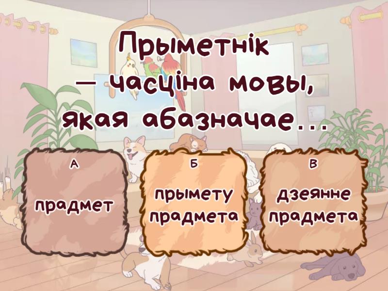1) Прыметнік – часціна мовы, якая абазначае… a) прадмет b) прымету прадмета c) дзеянне прадмета 2) У якім радку запісаны толькі прыметнікі? a) зялёны, смачны, холад, бялець b) зялёны, смак, халодны, белы c) зялёны, смачны, халодны, белы 3) У форме якога роду ўжыты прыметнік у сказе? На лясную палянку прыляцела чародка цецерукоў. a) жаночы b) мужчынскі 4) У якім сказе прыметнік ужыты ў форме множнага ліку? a) Бярозавая алея вядзе да школы. b) Чырвоныя гронкі рабін вісяць над агароджай. c) Яркае сонца выглянула з-за хмар. 5) У якім сказе прыметнік ужыты ў форме меснага склону? a) Лёгкі ветрык забаўляўся верхавінамі дрэў. b) У ціхім лясным возеры водзяцца шчупакі. c) Галасочкам тоненькім просіць зайка сонейка. 6) Адзнач сказ, у якім прыметнік ужыты у форме В. склону. a) Маленькі вожык п’е малако. b) У лесе тата заўважыў маленькага вожыка. c) У маленькага вожыка ёсць іголкі. 7) У якім сказе ўсе прыметнікі стаяць у форме Н. склону? a) Дзеці ўбачылі вялікі старажытны замак. b) Маленькае шчаня шукае добрага гаспадара. c) Лясное возера і сасновы бор чаруюць сваёй прыгажосцю. 8) Адзнач спалучэнне слоў, у якім прыметнік ужыты ў форме Т. склону. a) сумуе па родным доме b) жыве ў родным доме c) свеціць над родным домам 9) У якім сказе прыметнік стаіць у форме адз.л, м.р., Д. склону? a) Восенню хлопчык любуецца бярозавым гаем. b) Пеця зрабіў падарунак лепшаму сябру. c) Наша хата стаяла каля ляснога возера. 10) Знайдзі радок, у якім запісаны спалучэнні з прыметнікамі толькі жаночага роду : a) чыстае неба, бярозавы гай, летні вечар b) шырокая рака, кучаравая ліпа, трапяткая асіна c) цікавая казка, лясная госця, магутны дуб