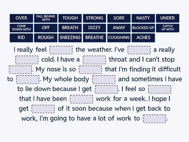 I really feel ____ the weather. I've ____ a really ____ cold. I have a ____ throat and I can't stop ____. My nose is so ____ that I'm finding it difficult to ____. My whole body ____ and sometimes I have to lie down because I get ____. I feel so ____ that I have been ____ work for a week. I hope I get ____ of it soon because when I get back to work, I'm going to have a lot of work to ____.