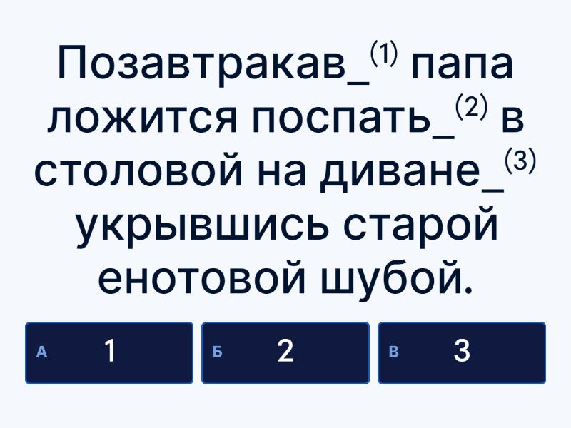 1) Позавтракав_(1) папа ложится поспать_(2) в столовой на диване_(3) укрывшись старой енотовой шубой. a) 1 b) 2 c) 3 2) Очутившись_(1) наверху_(2) красноармеец_(3) отошёл в сторонку_(4) и обиженно отвернулся_(5) закинув руки за спину. a) 1 b) 2 c) 3 d) 4 e) 5 3) Взглянув на часы_(1) генерал быстро поднялся_(2) и_(3) отодвинув тяжёлое кресло_(4) выбрался из-за стола. a) 1 b) 2 c) 3 d) 4 4) По утрам_(1) наколов дров_(2) и наведя чистоту во дворе_(3) Дмитрий Алексеевич_(4) отправлялся на прогулку. a) 1 b) 2 c) 3 d) 4 5) Фёдор Иванович_(1) отошёл в сторону_(2) и_(3) с разбегу схватившись за верхний край забора_(4) одним махом перескочил его. a) 1 b) 2 c) 3 d) 4 6) Ничего не понимая_(1) Сергей_(2) вглядывался в бледную полоску света_(3) идущую от лестницы. a) 1 b) 2 c) 3 7) Рыбаки_(1) откашливаясь_(2) и _(3) снимая шапки_(4) вошли в избу. a) 1 b) 2 c) 3 d) 4 8) Лодка_(1) прошуршав_(2) в камышах_(3) мягко ткнулась_(4) в песчаный берег. a) 1 b) 2 c) 3 d) 4 9) Тропинка шла_(1) вдоль высокого прибрежного обрыва_(2) извиваясь в тени_(3) столетних маслин. a) 1 b) 2 c) 3 d) 4 10) Зыбин вошёл_(1) и_(2) не спрашивая_(3) разрешения_(4) снял трубку. a) 1 b) 2 c) 3 d) 4