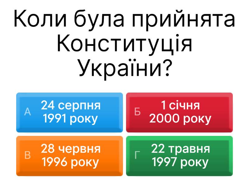 1) Коли була прийнята Конституція України? a) 24 серпня 1991 року b) 1 січня 2000 року c) 28 червня 1996 року d) 22 травня 1997 року 2) Яка стаття Конституції України визначає, що Україна є суверенною і незалежною державою? a) 1 b) 5 c) 10 d) 65 3) Яка форма правління закріплена в Конституції України? a) Монархія b) Президентська республіка c) Парламентсько-президентська республіка d) Федерація 4) Хто є гарантом Конституції України? a) Верховна Рада України b) Президент України c) Конституційний Суд d) Кабінет Міністрів 5) Яка мова є державною в Україні згідно з Конституцією? a) Англійська b) Українська c) Польська d) Німецька 6) В якій статті закріплено право народу визначати і змінювати конституційний лад? a) 1 b) 3 c) 5 d) 42 7) Що є найвищою юридичною силою в Україні? a) Закони України b) Рішення Верховної Ради c) Конституція України d) Укази Президента 8) Який орган має право вносити зміни до Конституції України? a) Президент України b) Верховна Рада України c) Конституційний Суд d) Кабінет Міністрів 9) Як називається перший розділ Конституції України? a) Права, свободи та обов’язки людини і громадянина b) Основи конституційного ладу c) Територіальний устрій України d) Президент України 10) Хто може бути обраним Президентом України? a) Громадянин України, який досяг 30 років b) Громадянин України, який досяг 35 років c) Громадянин України, який досяг 40 років d) Будь-який громадянин світу