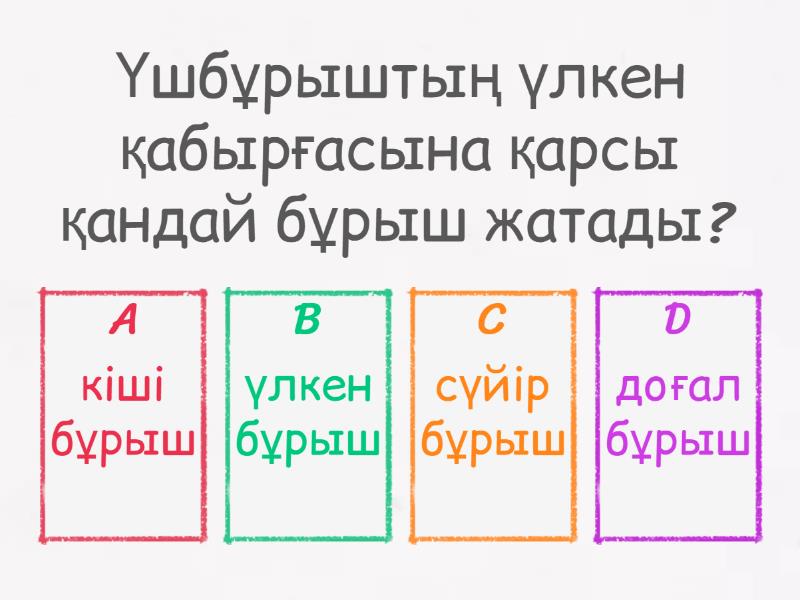 1) Үшбұрыштың үлкен қабырғасына қарсы қандай бұрыш жатады? a) кіші бұрыш b) үлкен бұрыш c) сүйір бұрыш d) доғал бұрыш 2) МNK үшбұрышында: NK> МK > МN. Бұрыштардың қайсысы үлкен? a) М b) N c) K d) бәрі тең 3) АВС үшбұрышында АВ=15 см, ВС=10 см, СА=8 см. Осы үшбұрыштың ең үлкен бұрышы қайсы? a) В b) А c) С d) бәрі тең 4) Тең қабырғаларға қарсы жатқан бұрыштар тең болады, ал тең бұрыштарға қарсы жатқан қабырғалар ше? a) тең b) үлкен c) кіші d) үлкен не тең 5) АОD үшбұрышында <А=<О=< D бұрыштары өзара тең. Бұл қандай үшбұрыш? a) тең бүйірлі b) тең қабырғалы; c) тік бұрышты d) сүйір бұрышты 6) Теореманы жалғастырыңдар.бұрыштың кез келген қабырғасы қалған екі қабырғасының.... a) қосындысынан үлкен болады; b) қосындысынан кіші болады; c) қосындысына тең болады. d) бұрыштарына тең болады 7) Қабырғалары 6 см, 3 см, 3 см үшбұрыш болуы мүмкін бе? a) мүмкін b) мүмкін емес c) дұрыс жауабы жоқ d) білмеймін 8) Тік бұрышты үшбұрыштың қай қабырғасына түсірілген биіктік ең қысқа болады? a) гипотенузаға b) үлкен катетке c) кіші катетке. d) доғал бұрышқа