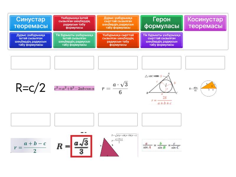 Үшбұрышқа сырттай сызылған шеңбердің радиусын табу формуласы, Үшбұрышқа іштей сызылған шеңбердің радиусын табу формуласы, Герон формуласы, Дұрыс үшбұрышқа сырттай сызылған шеңбердің радиусын табу формуласы, Дұрыс үшбұрышқа іштей сызылған шеңбердің радиусын табу формуласы, Тік бұрышты үшбұрышқа сырттай сызылған шеңбердің радиусын табу формуласы - R=c/2, Тік бұрышты үшбұрышқа іштей сызылған шеңбердің радиусын табу формуласы, Синустар теоремасы, Косинустар теоремасы,