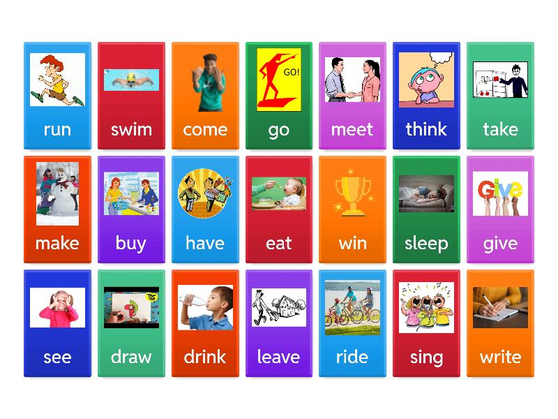 go - went, have - had, see - saw, make - made, write - wrote, buy - bought, eat - ate, sing - sang, come - came, ride - rode, give - gave, drink - drank, draw - drew, take - took, win - won, sleep - slept, think - thought, run - ran, swim - swam, meet - met, leave - left,