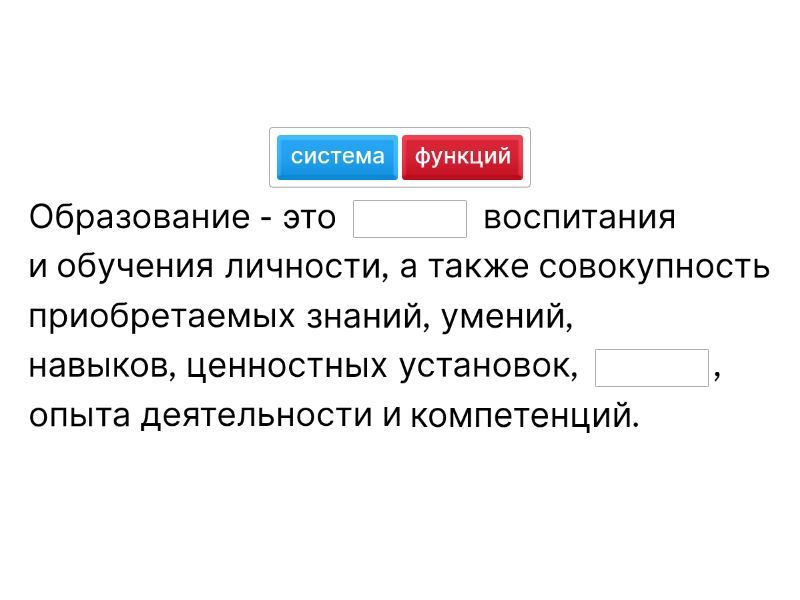 Образование - это ____ воспитания и обучения личности, а также совокупность приобретаемых знаний, умений, навыков, ценностных установок, ____, опыта деятельности и компетенций. Виды Образования Начальное ____ Высшее ____ ____ об образование ____ года