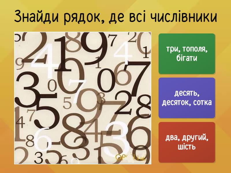 1) Знайди рядок, де всі числівники a) три, тополя, бігати b) десять, десяток, сотка c) два, другий, шість 2) Числівником є слово... a) п'ятизірковий b) другорядний c) вісім 3) Порядковим є числівник a) півтора b) п'ятеро c) дев'ятий 4) Знайдіть числівник в реченні: Краще на п'ять хвилин раніше, ніж на хвилину пізніше. a) п'ять b) краще c) хвилин 5) Котра година на малюнку? a) чверть на дев'яту b) чверть на восьму c) за п'ятнадцять хвилин дев'ята 6) Як правильно написати словом числівник 4? a) читири b) чотири c) четири 7) Як правильно написати словом числівник 5, щоб він відповідав на питання "котрий"? a) пятий b) п'ятий c) пятій 8) Правильним є написання a) шисть b) шість c) шіст 9) Правильним є написання a) девятнацять b) дев'ятнацять c) дев'ятнадцятий 10) Правильним є написання a) двадцяць девять b) двадцять дев'ять c) двадцять девяць