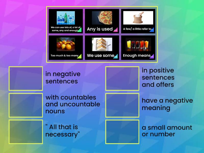 Too much & too many ... - have a negative meaning, A few/ a little refer to... - a small amount or number, Any is used ... - in negative sentences, Enough means... - " All that is necessary", We can use lots of, a lot of, some, any and enough... - with countables and uncountable nouns, We use some... - in positive sentences and offers,