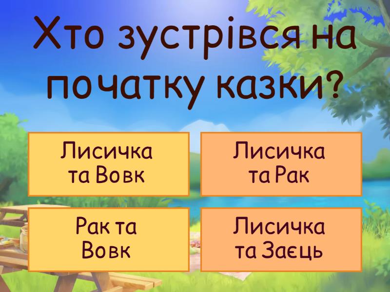 1) Хто зустрівся на початку казки? a) Лисичка та Вовк b) Лисичка та Рак c) Рак та Вовк d) Лисичка та Заєць 2) Як Лисичка ставилася до Рака на початку розмови? a) З повагою b) Байдуже c) З насмішкою d) Дружньо 3) Про що Лисичка запитала Рака? a) Про його друзів b) Про те, як ходив по дріжджі c) Про його швидкість d) Про його родину 4) Що запропонував Рак Лисичці? a) Разом пограти b) Помиритися c) Пообідати разом d) Позмагатися в бігу 5) Як Рак обійшов Лисичку під час змагання? a) Перестрибнув через лисицю b) Пробіг попереду c) Учепився за її хвіст d) Пішов іншою дорогою 6) Де відбувалися події казки? a) У лісі b) Біля пенька c) У полі d) На галявині