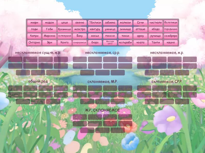 несклоняемое сущ.-е, м.р.: атташе, кенгуру, маэстро, месье, конферансье, коала, Сочи, Тбилиси, Баку, Таити, Капри, несклоняемое, ср.р.: бюро, такси, кашне, жюри, жалюзи, сомбреро, пенсне, Онтарио, Эри, несклоняемое, ж.р.: леди, кольраби, авеню, фрау, мадам, цеце, Миссури (река), Гоби, Конго, Марокко, общий род: ябеда, чистюля, умница, забияка, склоняемое, М.Р. : городишко, соловушка, склоняемое, СР.Р.: болотище, бревнище, Ж.Р., СКЛОНЯЕМОЕ: ручища, зимища,