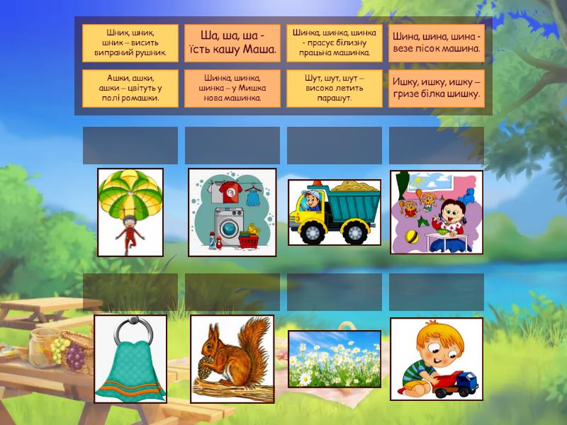 Ша, ша, ша - їсть кашу Маша. , Шина, шина, шина - везе пісок машина. , Шинка, шинка, шинка - прасує білизну працьна машинка. , Шинка, шинка, шинка – у Мишка нова машинка., Шут, шут, шут – високо летить парашут., Шник, шник, шник – висить випраний рушник., Ишку, ишку, ишку – гризе білка шишку., Ашки, ашки, ашки – цвітуть у полі ромашки.,