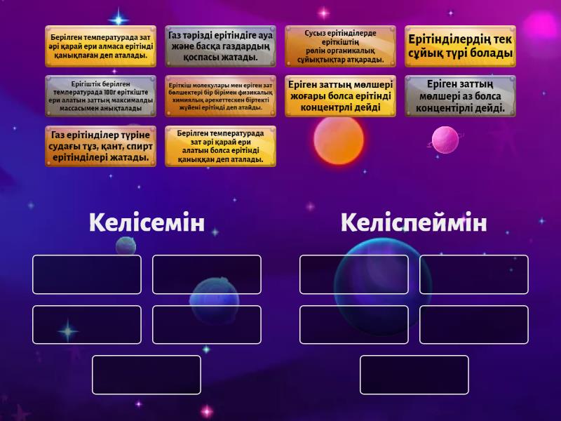 Келісемін: Сусыз ерітінділерде еріткіштің рөлін органикалық сұйықтықтар атқарады., Еріткіш молекулары мен еріген зат бөлшектері бір бірімен физикалық химиялық әрекеттескен біртекті жүйені ерітінді деп атайды., Еріген заттың мөлшері жоғары болса ерітінді концентрлі дейді, Ерігіштік берілген температурада 100г еріткіште ери алатын заттың максималды массасымен анықталады, Газ тәрізді ерітіндіге ауа және басқа газдардың қоспасы жатады., Келіспеймін: Газ ерітінділер түріне судағы тұз, қант, спирт ерітінділері жатады., Берілген температурада зат әрі қарай ери алмаса ерітінді қанықпаған деп аталады., Берілген температурада зат әрі қарай ери алатын болса ерітінді қаныққан деп аталады., Еріген заттың мөлшері аз болса концентірлі дейді., Ерітінділердің тек сұйық түрі болады,