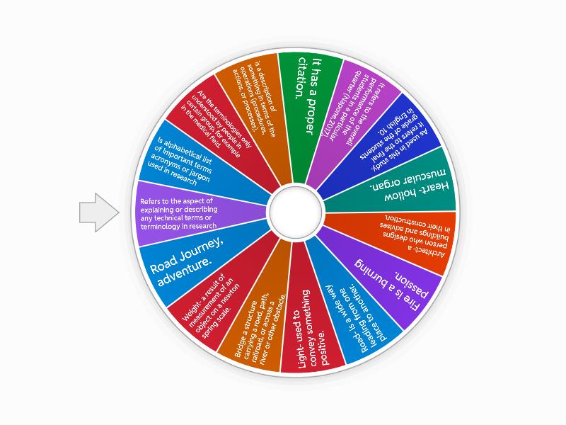 1) Is alphabetical list of important terms acronyms or jargon used in research 2) Are the terminologies only understood by people in certain group, for example in the medical field. 3) is a description of something in terms of the operations (procedures, actions, or processes). 4) It has a proper citation. 5) It refers to the overall performance of the students in a particular quarter (Napone,2017). 6) As used in this study, it refers to the final grade of the students in English 10. 7) Heart- hollow muscular organ. 8) Architect- a person who designs buildings and advises in their construction. 9) Fire is a burning passion. 10) Road- is a wide way leading from one place to another. 11) Light- used to convey something positive. 12) Bridge a structure carrying a road, path, railroad, or across a river or other obstacle. 13) Weight- a result of measurement of an object on a newton spring scale. 14) Road Journey, adventure. 15) Refers to the aspect of explaining or describing any technical terms or terminology in research
