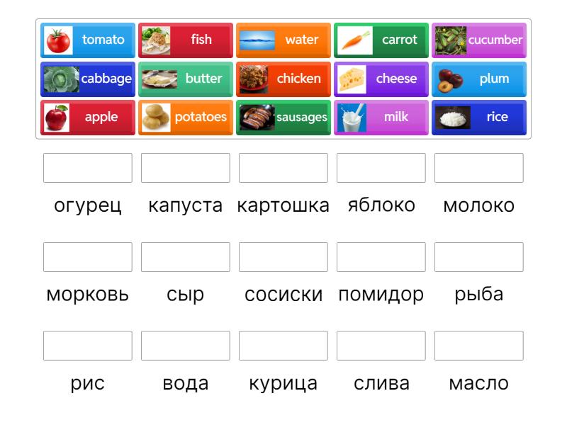 cheese - сыр, milk - молоко, sausages - сосиски, plum - слива, fish - рыба, cabbage - капуста, cucumber - огурец, tomato - помидор, rice - рис, water - вода, butter - масло, chicken - курица, carrot - морковь, potatoes - картошка, apple - яблоко,